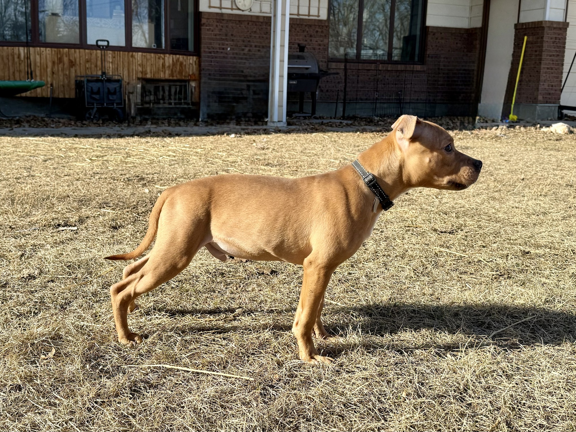 Rosa is a canon ball of craziness that we kept from a litter between Navy and Victor. She is small, spunky, and proving that she has everything I’m looking for in a Stafford. Rosa is 13″ tall and a chunky 26.5lbs. We have big hopes for her in the future.